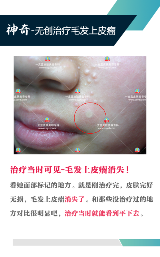 【蛋白凝固法治疗毛发上皮瘤】 我院使用“蛋白凝固法”治疗毛发上皮瘤(“一支蓝”也是全国唯一掌握该项治疗专利技术的专科),具有见效快、无激光、无冷冻、无烧灼、无碳化、无腐蚀、无刺激、无创伤、无疼痛、无疤痕、无副作用等十大优点。“蛋白凝固法”治疗毛发上皮瘤,是专业微雕操作,可以精确到每颗毛发上皮瘤,当场即可目睹瘤体萎缩,皮肤恢复光滑。此法有三大先进之处: 1.能自动识别毛发上皮瘤,精确到每一个瘤体,对周围正常皮肤组织无影响。 2.能自动控制深度,精确到毛发上皮瘤的根部,彻底根除,不留痕,不复发。 3.无创伤,治疗后可洗脸洗澡,皮肤能快速恢复光洁,不影响正常工作和生活。
