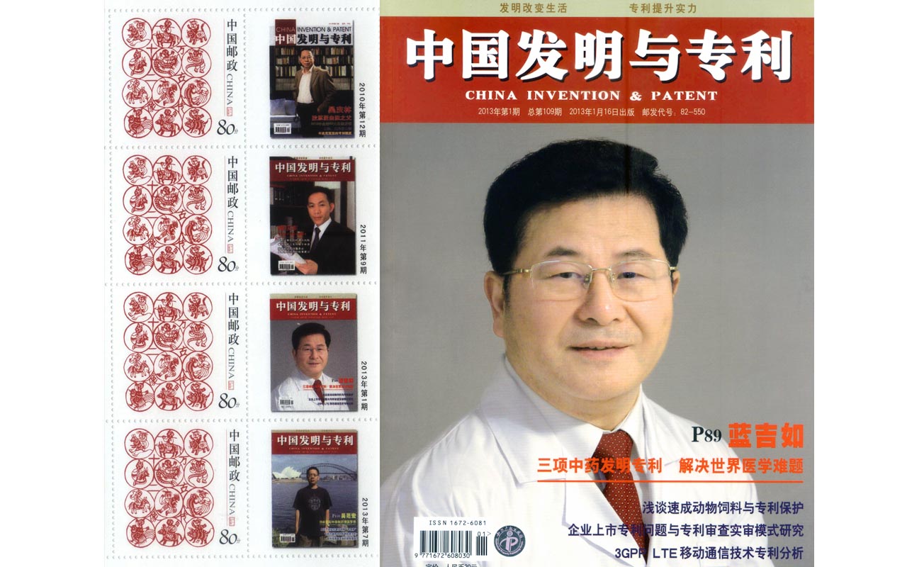 ![]() 中国邮政发行-蓝吉如教授发明专利纪念邮票 2013年1月10日,一年一度的“国家科学技术奖励大会“,在北京人民大会堂隆重举行,国家主席习近平亲自给获奖科学家颁奖,与此同时,由国家领导人和专家院士共同题词的《中国发明与专利》杂志创刊10周年纪念邮册,由中国人民邮政同步向全世界公开发行。表明国家对“科学技术,创造发明”的高度重视和强力扶持。该邮册以有重大发明创造的中国国家科学院,中国工程院院士和为国家专利技术作出突出贡献的发明人物为代表,印制成精美纪念邮票,以表彰他们为科技强国所做出的卓越贡献。蓝吉如教授,因其在中医药领域三项重大国家发明专利,成功解决世界性疑难皮肤疾患,荣登2013年1月《中国发明与专利》杂志封面,同时成为国家发明专利纪念邮票中的代表人物。