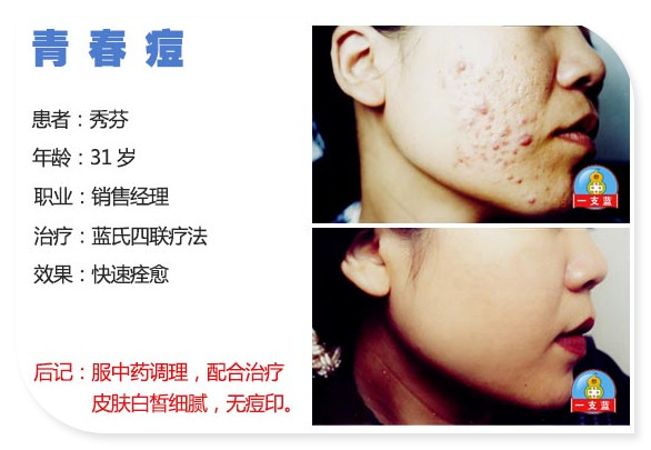 我是任职于公司的销售部门,平时工作压力很大,再加上经常加班熬夜,睡眠不足,饿了也是吃快餐。脸上突然就冒出了几颗痘痘,我想是因为没休息好的原因吧,也就没有在意,用化妆品遮盖就行了。可没过一个星期,脸上的痘痘越来越多,这下我着急了,工作都没心思了,业绩达不到,心情就更加郁闷。去医院检查,拿药,偏方治疗,我全都试过了,可效果都不明显,痘痘只增不减。每天下班回家,我都会坐在电脑面前,查找治疗青春痘的方法。 有天我偶然看到深圳一支蓝专业祛痘的文章,感觉有点靠谱,马上打电话咨询他们。深圳一支蓝专家通过询问,分析了长痘的原因,说我由于精神压力过大,熬夜加上饮食不节,引起体内雄性激素分泌过多,刺激毛囊皮脂分泌过多、影响皮肤的代谢,导致痘痘久治不愈。第二天我就直接去了一支蓝。医生仔细检查我的情况以后,给我讲了治疗方案和治疗期间的注意事项。原来一支蓝是采用中医中药为主的“蓝氏四联治疗法”治疗青春痘的。我也看到诊室里,来来往往有很多的青春痘患者,有个妹妹还和我说,她已经治疗了一段时间,有很大的好转呢,于是我抱着试试看的心情,开始认真按医生的要求来定期治疗青春痘。由于我长痘痘的时间久,脸上或多或少也留下了一些痘印。前期通过内调外治,对症消炎,我脸上的痘痘已经控制不长了,中间通过修复治疗,脸上的痘印也淡化了。现在我脸上的痘痘已经完全没有了,连长过痘痘的痕迹都找不到了!皮肤觉得比以前更白,更光滑细腻了,真的好开心! 太感谢一支蓝的医生护士们啦!也希望和我一样脸上有痘痘的同龄人早日战痘成功! 让我们将青春留下,让痘痘远离! 患者:李秀芬 2010.8.2